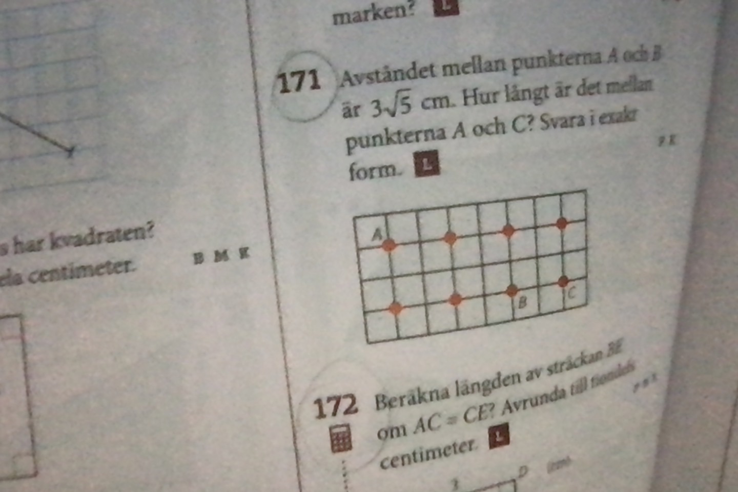 jag försökte genom att kalla distansen mellan två prickar för x. Då kunde jag säga att distansen mellan A och be var hypotenusan i en triangel, och att sidorna var x och 2x.