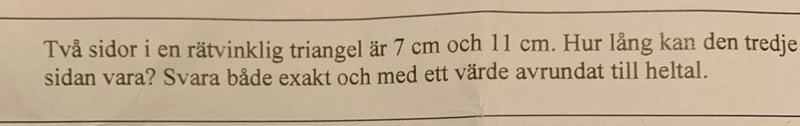 Eller så kan du tänka att sidan 11 är hypotenusan, då får du istället: