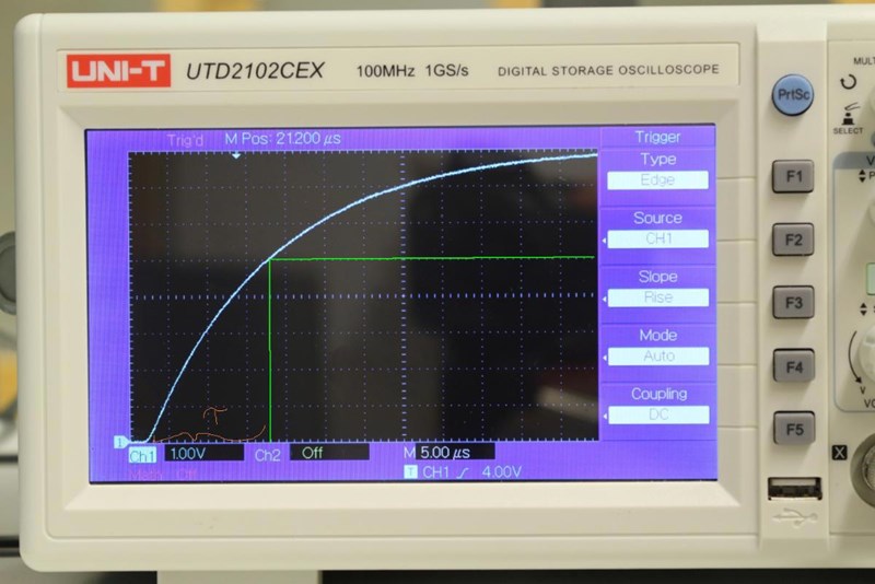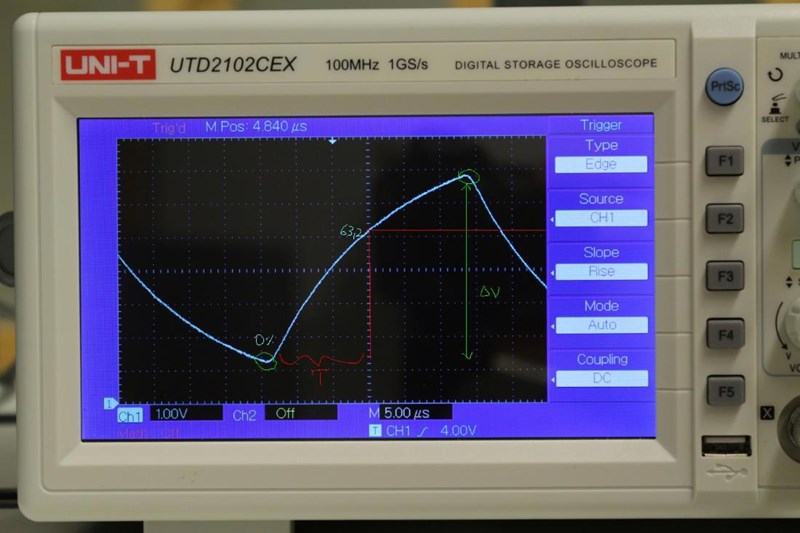 Jag tog 63,2% av den totala spänningen (8V) vilket motsvarar och sedan räknade jag tidskonstanten manuellt från bilden. Se nedan