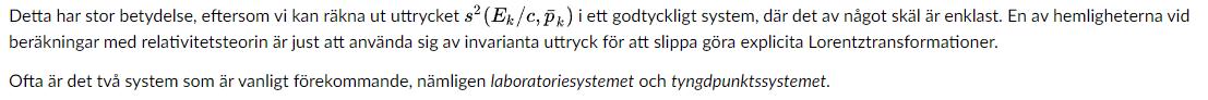 Det jag inte förstår är om jag ska lösa uppgiften med tyngdpunktssystemet eller transformera den till labratoriesystemet. Jag fattar inte alls hur man ska transformera allt till invarianta intervall. Jag försöker men får inte ens något svar. I tyngdpunktsystemet är ju rörelsemängden totalt sett 0 både innan och efter reaktion. Eftersom positronens och elektronens vilomassa är samma så borde det inte vara så svårt att räkna ut det tänker jag men fattar inte hur jag ska transformera allt. Uppskattar verkligen hjälp då jag inte får någon hjälp av lärare eftersom de inte har gett ut sina kontaktuppgifter och svarar inte i kursens diskussions forum.