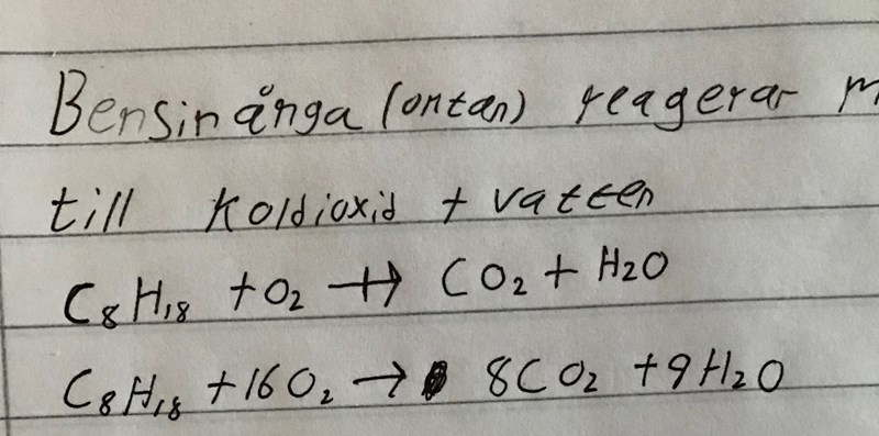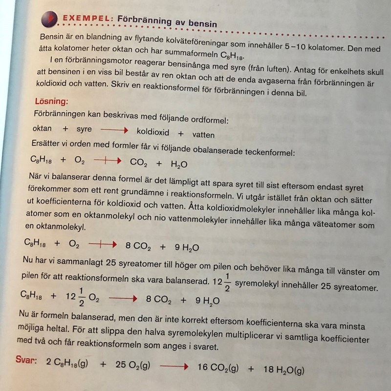 Det behövs alltså 25 mol syreatomer för fullständig förbränning av 1 mol oktan, men syre "säljs bara i tvåpack" så det går åt 12½ mol syremolekyler. Men man vill inte ha bråk i reaktionsformlerna, så man multiplicerar allt med 2.