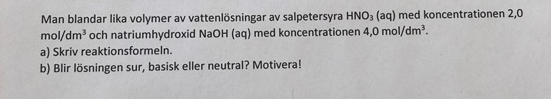 b) Tillsätts fler mol hydroxidjoner än vätejoner? Då blir den basisk. Fler vätejoner? Sur. Lika många? Neutral.