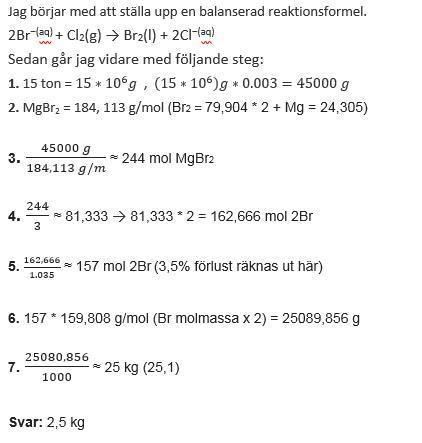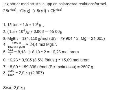 1. Hur många kg brom (Br 2)kan man få i utbyte genom att leda in klor (Cl2) i 15 ton av en lösning som innehåller 0,3 % MgBr2 om förlusterna uppgår till 3,5 %?
