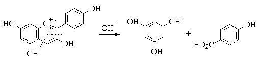 Reaktionsformel, nedbrytning av antocyanidiner i alkalisk miljö
