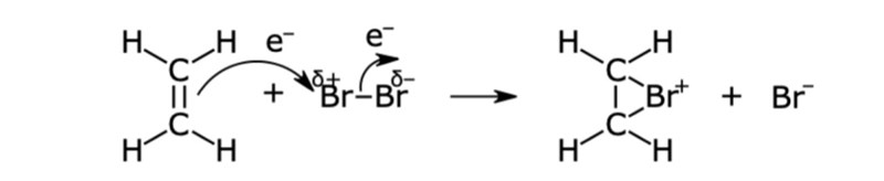 På bilden ser vi formeln för en rektionsmekansim. Eten reagerar med brom. Brom reagerar med elektronerna i dubbelbindning, den positiva delen reagerar med den negativa laddade elektroner.