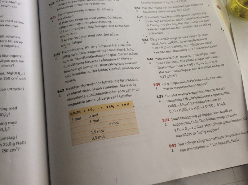 Titta på reaktionsformeln! Där står det att 1 mol etanol reagerar med 3 mol syrgas och att det då bildas 2 mol koldioxid och 3 mol vatten. Om det exempelvis är 5 mol etanol kommer det att reagera med 15 mol syrgas och bilda 10 mol koldioxid och 15 mol vatten.
