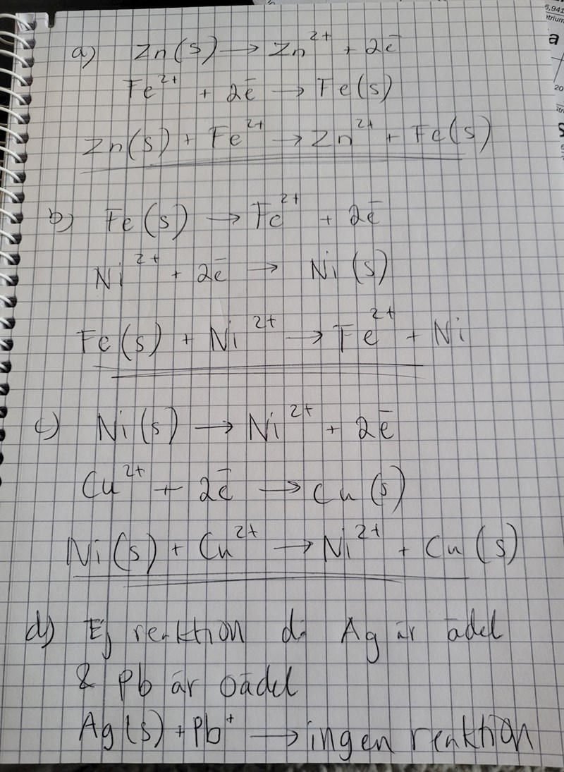 Du bör motivera vilka reaktioner som sker eller inte,antingen genom elektrokemiska spänningsserien eller med normalpotentialer.