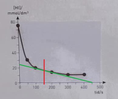 naytte skrev:Är du med på att lutningen i punkten ger reaktionshastigheten för reaktionen då 150 sekunder har gått?
