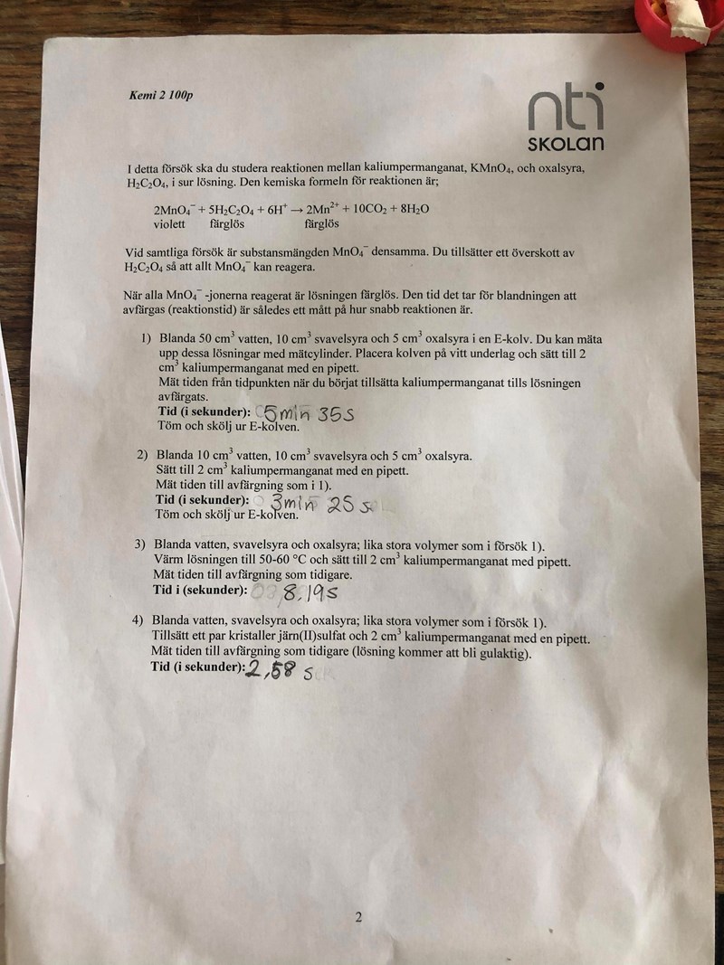 jag skriver just nu en labbrapport om hur reaktionshastigheten påverkas i en lösning av oxalsyra, svavelsyra, permanganatjoner och vatten beroende på om man ändra vattenvolymen, temperaturen eller om man tillsätter järn(||)sulfat.