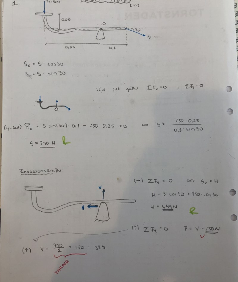 Jag har försökt lösa uppgiften: Med en fot ges en vertikal kraft P=150N på pedalen så att kraften i vajern blir S. Måtten i figuren är h = 8cm, b= 25cm, a=10cm och vajern bildar vinkeln = 30° med horisontalplanet.