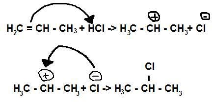 1-propen får reagera med väteklorid. Skriv reaktionsmekanism.
