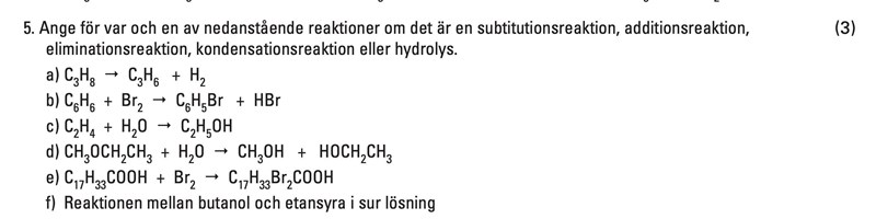 Ange för var och en av nedanstående reaktioner om det är en subtitutionsreaktion, additionsreaktion, eliminationsreaktion, kondensationsreaktion eller hydrolys.