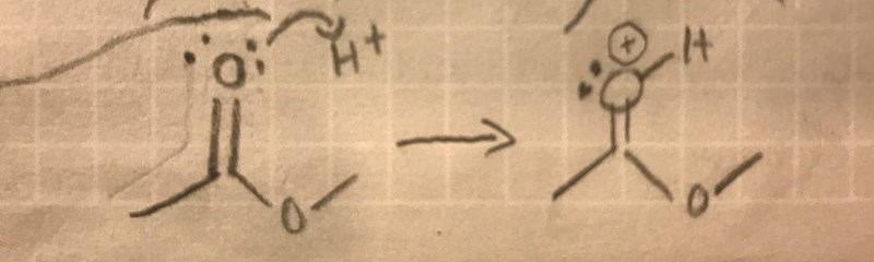 Pilarna föreställer ett elektronpar, som hoppar från att vara ett fritt elektronpar på syreatomen till att bli ett bindande elektronpar till vätet. Det skall fortfarande vara ett plus någonstans - den positiva laddningen försvinner inte för att elektronerna flyttar sig. Eftersom den här modellen visar att elektronerna finns mellan syret och vätet kan man placera den positiva laddningen som man har gjort.