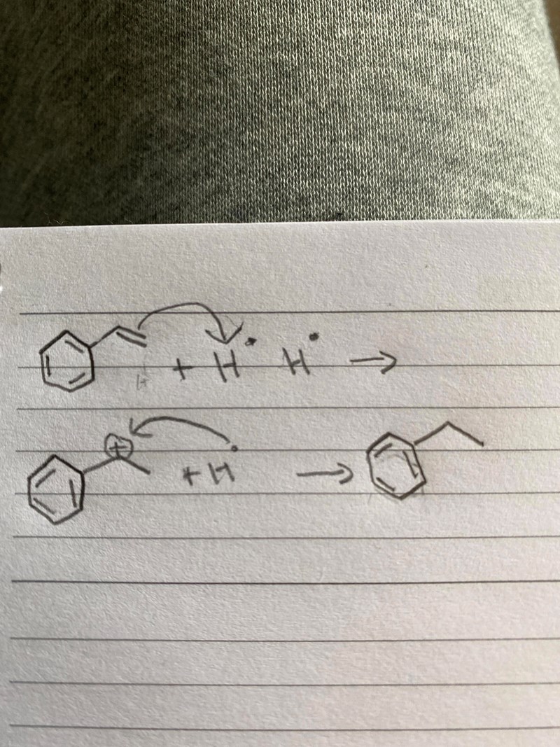 Nånting åt det hållet. Jag är lite osäker på hur man egentligen bör göra i detta fall eftersom pilarna ska visa hur elektronerna rör sig men de rör sig ju åt flera håll samtidigt, dvs väteradikalerna donerar elektroner till styren och styren donerar elektroner från dubbelbindningen till väteradikalen. Det bästa är kanske att rita en pil åt vardera håll i både första och andra steget.