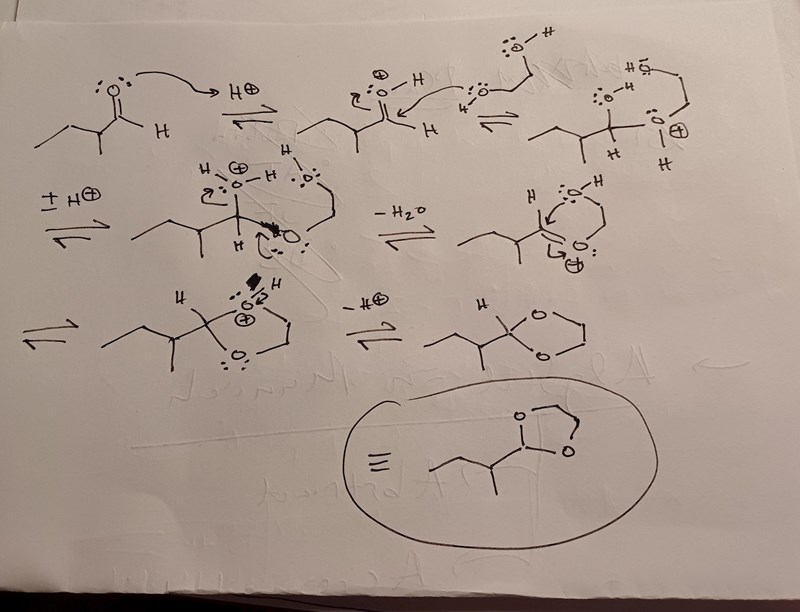 Du har fått med flera korrekta delsteg (till exempel att de två OH-grupperna på alkoholen agerar nukleofil, och att karbonylkolet i aldehyden agerar elektrofil två gånger), men det försvinner atomer, elektroner och laddningar på vägen, som gör att slutprodukten blir fel!