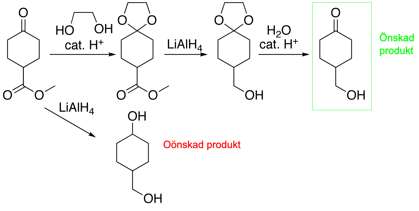 Till exempel här, där man har både en ester- och en ketongrupp, och vill reducera estergruppen (men inte ketongruppen!) med hjälp av reduktionsmedlet LiAlH4. Kör man på med reduktionsmedlet direkt så förstör man ketonen, men med hjälp av tricket vi precis har gått igenom kan man temporärt skydda ketonen, genomföra reduktionen, och sedan återställa ketonen: