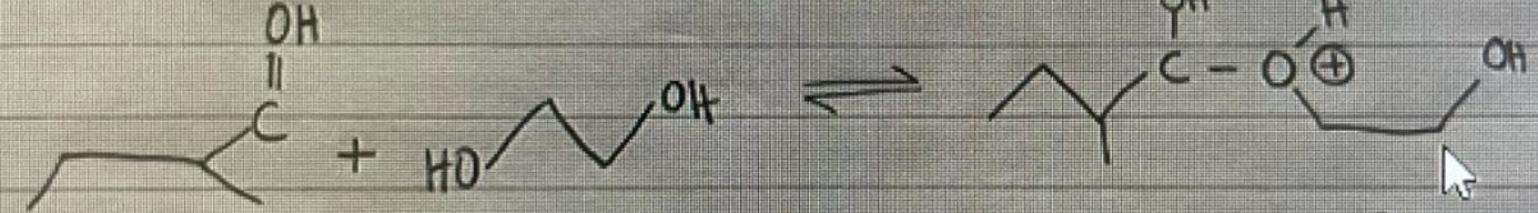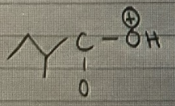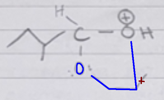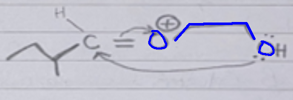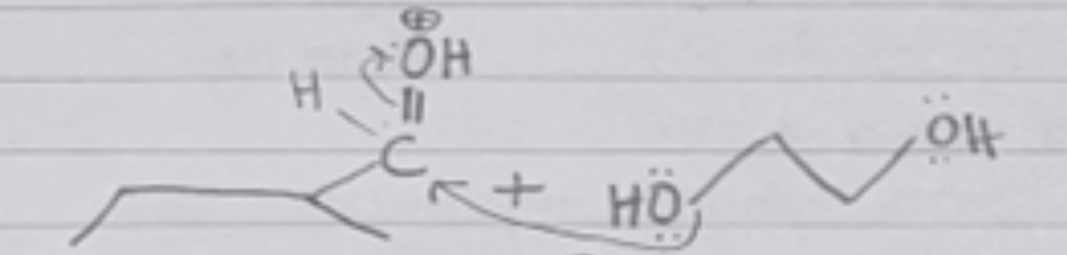 Steg 2: Nukleofil attack. Här saknas en pil från elektronparet i nukleofilen, men det är helt korrekt att syret i OH-gruppen blir plusladdat.