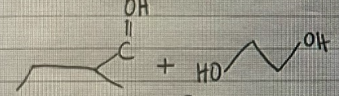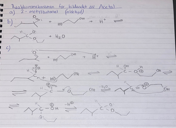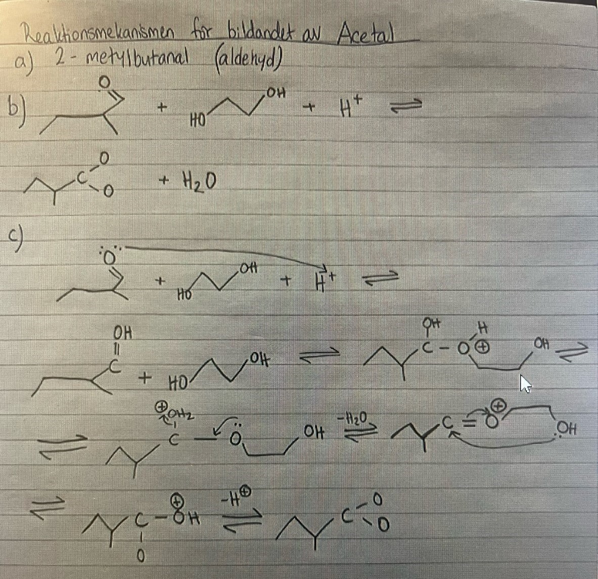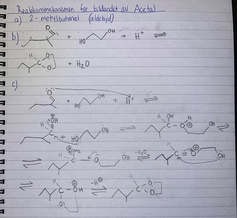 b. Tänk dig att aldehyden reagerar med etan-1,2-diol under sura betingelser. Rita en balanserad reaktionsformel för reaktionen.