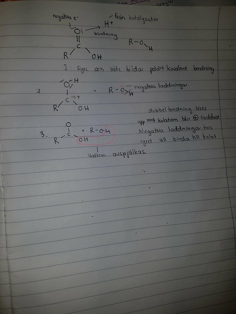 Teraeagle skrev :Figuren stämmer fram till steg 3. När kolet har fått en positiv laddning så gör syret i hydroxigruppen hos alkoholen en nukleofil attack. I nästa steg avges OH-delen av karboxylsyrans COOH-grupp.