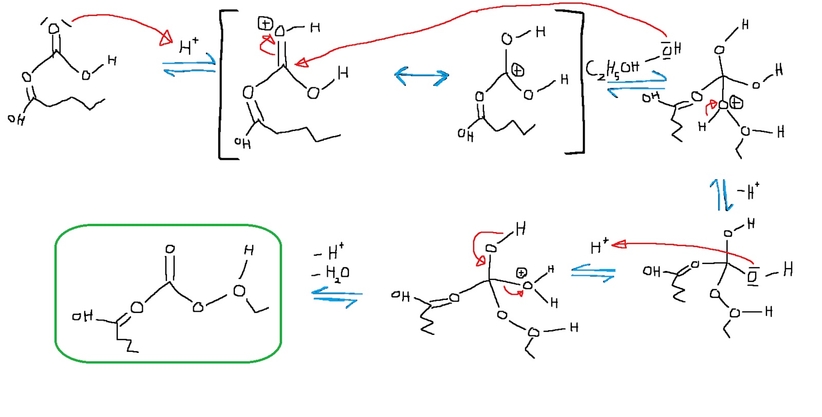 Reaktionsmekanism för estersyntes av pentansyra, etanol + svavelsyra