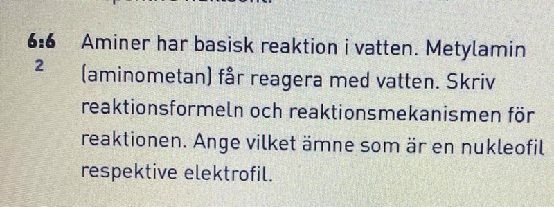 Jag har fastnat på denna fråga, förstår inte riktigt varför metylamin ses som en bas i denna reaktion då vattnet också har fria elektronpar som kan göra den till en nukleofil. Dessutom har vattnet 2 friaelektronpar jämfört med metylaminens 1 elektronpar. Vore tacksam för förklaring!