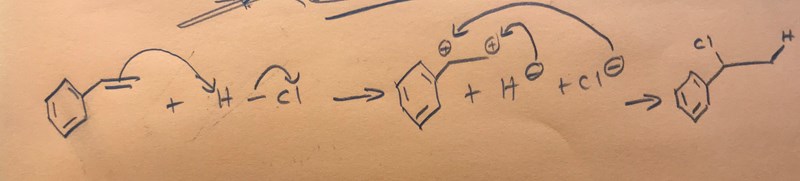 Det är inte så att elektronerna hoppar över till vätet och att sedan vätet binder till kolatomen, utan vätet i HCl lossnar samtidigt som det får elektroner från kolatomen (läs: bimder till kolatomen). Det hela sker i ett enda steg.