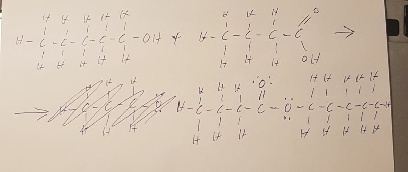 b) Framställningen av pentylbutanoat är en jämviktsreaktion. Skriv reaktionsformeln med strukturformler för de organiska ämnena, och teckna jämnviktskonstanten K.