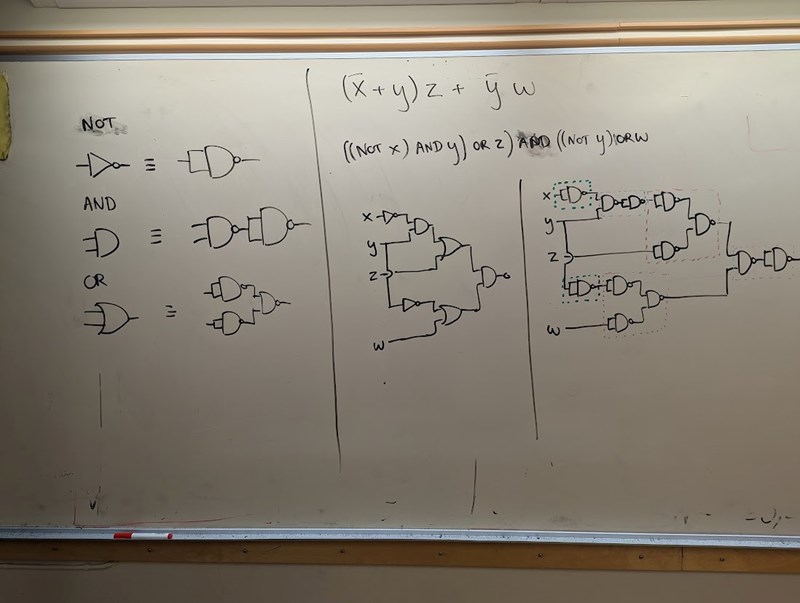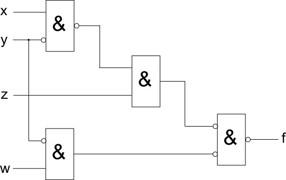 Eftersom alla operationer kan konstrueras med NAND-portar så kan man också bara bruteforca en lösning med blockdiagrammen direkt genom att ersätta NOT, AND, och OR individuellt. Kanske inte blir den snyggaste lösningen och är svårt att återföra till boolsk notation men är 'lätt' att få själva schemat.