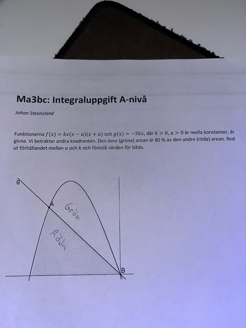 Precis, för att lösa ut denna arean skrev jag uttrycket , detta är ju den totala aren inom intervallet -a (första skärningspunkten) och origo, det vill säga parabeln som syns på bilden