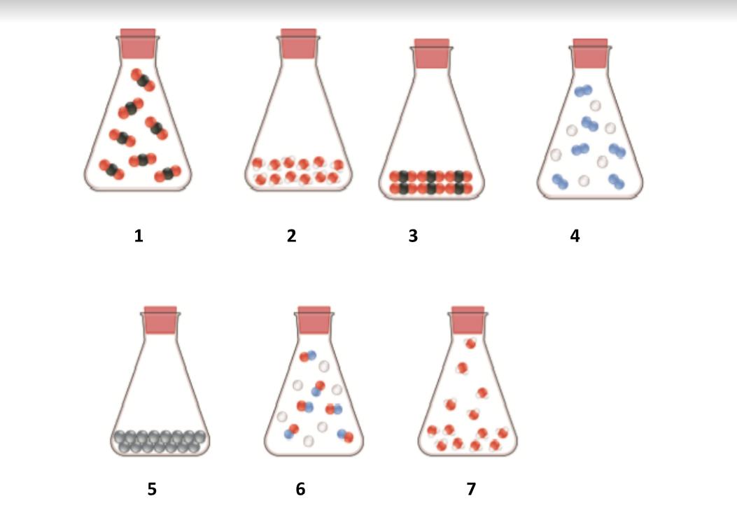 Bägaren 5 är ett grundämne, medans 7, 3, 1, 2 är kemiska föreningar. Bägaren som är en blandning av bägge är 6, 4.