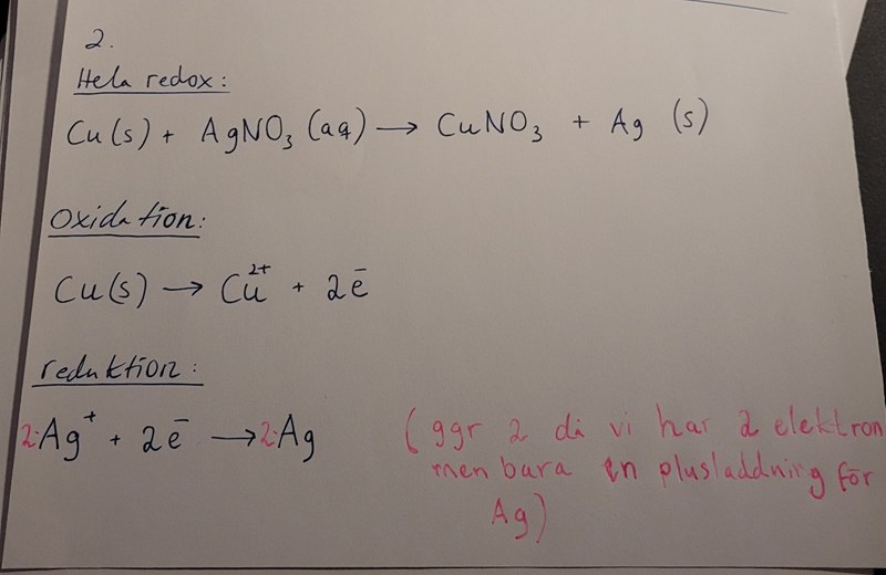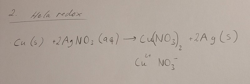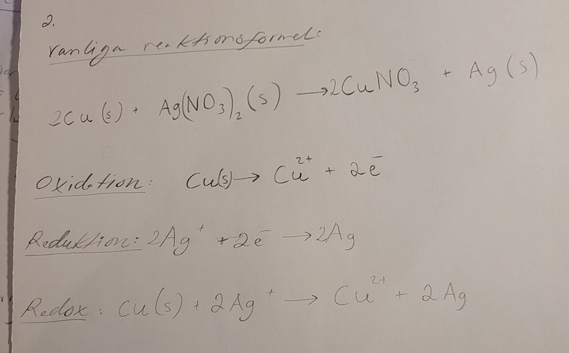 Man doppar kopparplåt i en silvernitratlösning. Skriv reaktionsformeln för oxidation, reduktion, hela redoxreaktionen.