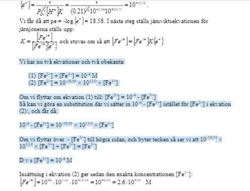 Lös ut [Fe2+] ur ekvation (1): [Fe2+] = 10-4-[Fe3+]. Sätt in detta i ekvation (2): 10-4-[Fe3+] = 10-18,58 . 1013 . [Fe3+]