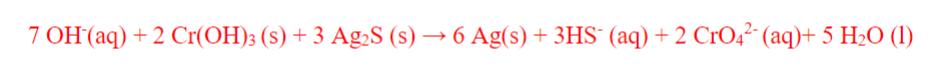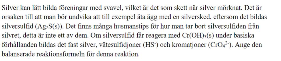Hej! Jag har kommit fram till att redox är: Ag2S ---> Ag och Oxidation CrOH3 ---> CrO4^2-. Men längre än så kommer jag inte. Vet till exempel inte vad som händer med S och hur det i facit kan stå såhär.