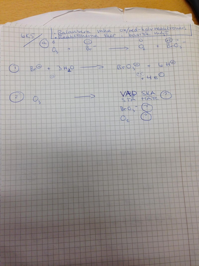 Det bildas syrgas. Du kan inte få det från reaktion (1) så det måste komma från reaktion (2). Du har heller ingen brom i reaktion (2) och då kan du inte bilda BrO3- där.