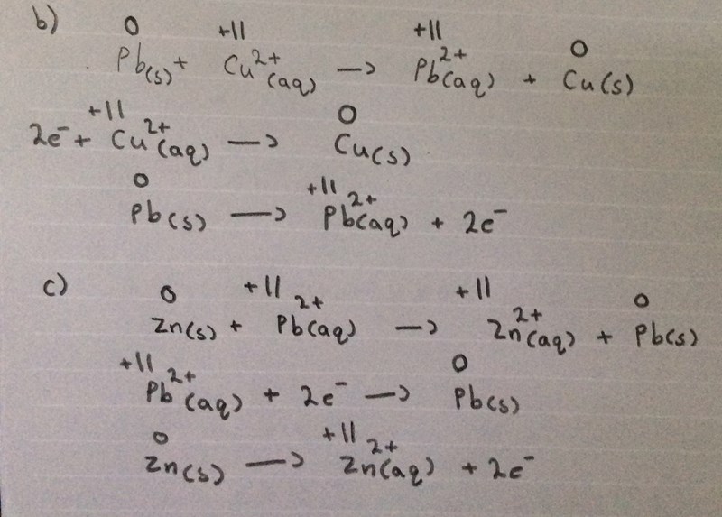 I uppgiften b,c ser jag däremot att både bly och zink metallen kommer att oxideras, då jonerna de kommer i kontakt med har högre elektronegativitet än vad de själva har. Däremot vet jag ej vad koppar jonen har för oxidationstal och det är därför lite svårt att kunna skriva ett reaktionsformel. Vad är det jag missar?