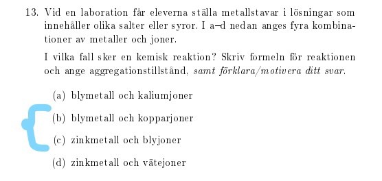 För att lösa denna uppgift använder jag mig utav den elektrokemiska spänningsserien. Jag vet att i fråga a) så händer det ingenting då kaliumjonerna inta kan oxidera blymetallen.