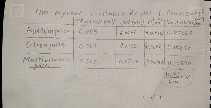 De värdena en beräknar från den delen ska hjälpa en med andra delen som är att titrera 3 ml citronjuice, apelsinjuice respektive multivitamindryck, med jodlösning.