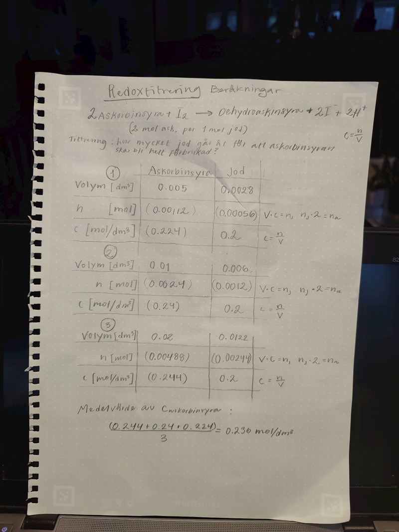 I denna lab titrerar en först askorbinsyra med jodlösning, 5 ml, 10 ml och 20 ml. I dessa lösningarna är 2 ml stärkelse också iblandat som indikator när all askorbinsyra har reagerat.