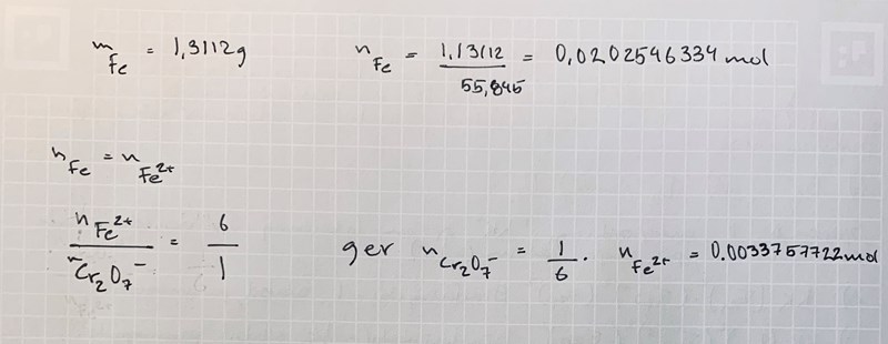 Bra! Nästa steg är att räkna ut hur många mol dikromatjoner som har blivit tillsatt vid ekvivalenspunkten. Utifrån det kan du räkna ut hur många järn(II)-joner som har reagerat och fanns i provet. Du vet att en mol dikromatjoner reagerar med 6 mol mol järn(II)-joner.