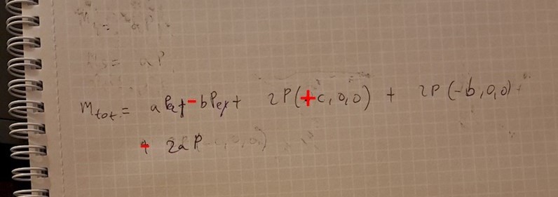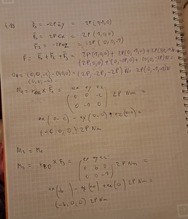 Jag fick fel på momentberäkningen och har gjort på följande sätt. Jag vet ej hur man sk tänka med högerhandsregeln osv momentet där kraftpar (P,-P) är på.