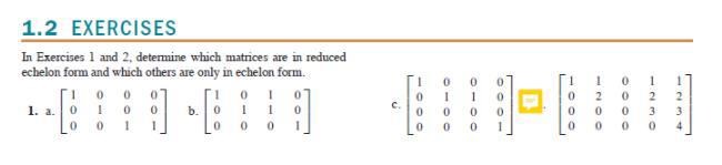 Här har jag en uppgift då man ska bestämma om följande är reducerad trappstegsform eller endast trappstegsform. Facit säger att a och b är på reducerad trappstegsform, d är på trappstegsform och c är inget. Jag tycker att a är i reducerad trappstegsform men att både b c och d är ingen eftersom dom både innehåller motsägerlser i sin sista rad ([0 0 0 1]). Och om dom inte tar hänsyn till motsägelsen bör väll både a b och c vara reducerad medan d är endast trappstegsform. Så varför har facit sagt att c inte är någon av dem? Men kan nån förklara varför jag har fel?