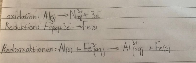 På den första frågan så vet jag att järn har en mindre reducerande förmåga än aluminium alltså så är det aluminium som vill avge sina elektroner. Jag vet att aluminium vill avge tre elektroner. Det finns både II-järnjoner(2+) och III-järnjoner(3+). Eftersom att aluminium vill avge tre elektroner så tänker jag att det är III-järnjonen(3+) som ska användas i detta fall. Alltså så ser delreaktionerna och redoxreaktionen så här ut. Stämmer det?