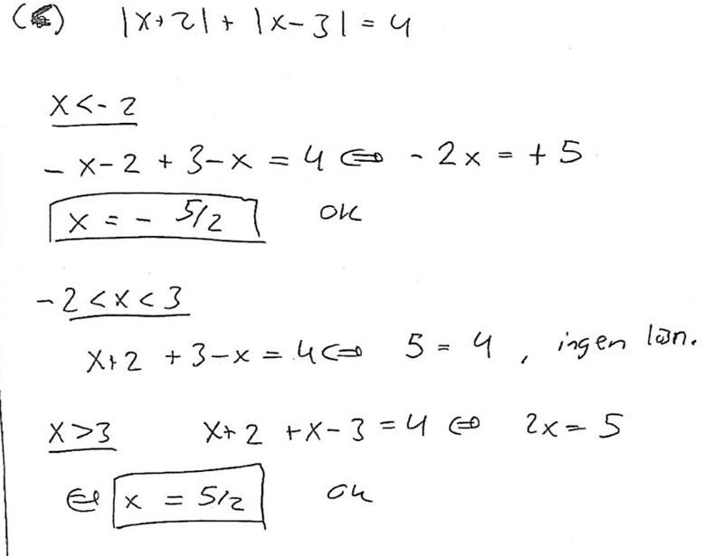 Vad hävdar ditt facit att det finns för lösningar? Man kan tolka absolutbeloppet som avståndet mellan a och b på tallinjen. är alltså avståndet mellan och plus avståndet mellan och . Eftersom avståndet mellan och är kan det omöjligt finnas något tal så att summan av avstånden blir .