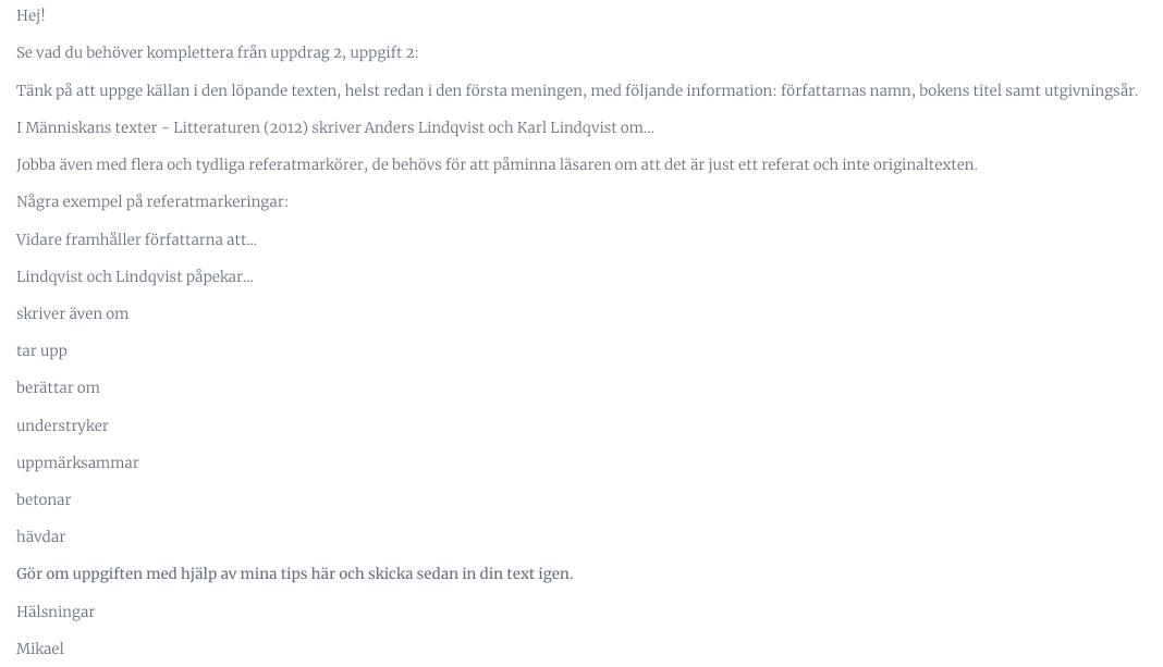 Jag hade längesen en uppgift om att skriva min referat. Idag kollar jag på min bedömning i svenska 2 och märker att jag har en rödmarkerad kunskapskrav.