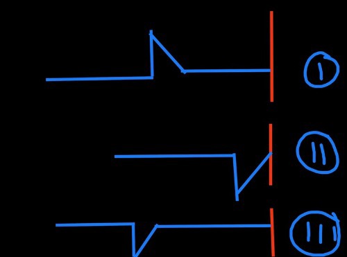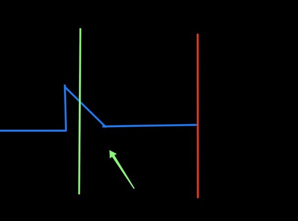 Vi ser att första delen av pulsen, "värde ungefär noll", är först även sedan pulsen har reflekterats. Titta på den figuren och fråga om något är oklart.