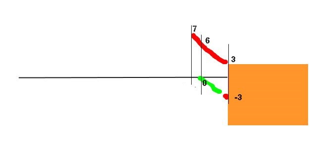 Vid det högra strecket adderar vi ihop bidragen till 3 + -3 = 0
