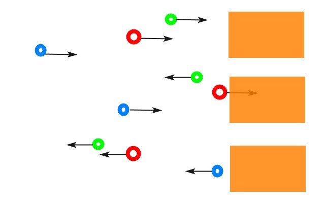 Figuren visar tre tidpunkter. Överst åker alla bollar mot väggen. I mitten har den gröna studsat, medan röd och blå fortsätter mot väggen. Nederst har alla bollar studsat. Grön var först till väggen, så den är naturligtvis först även när bollarna åker åt vänster. Inget konstigt med den studsen, hoppas jag?