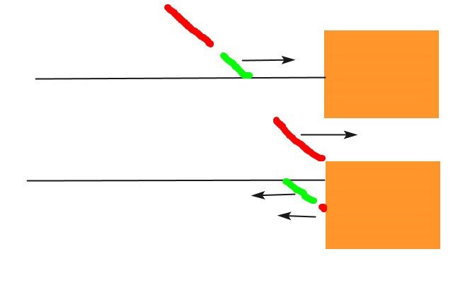 Till sist gör vi pulsen lite längre, och markerar den sista delen röd. Vad händer då när den gröna delen har reflekterats helt, men inte riktigt hela den röda delen? Titta på figuren och fråga på det som känns oklart: