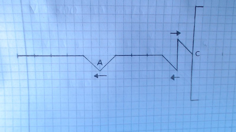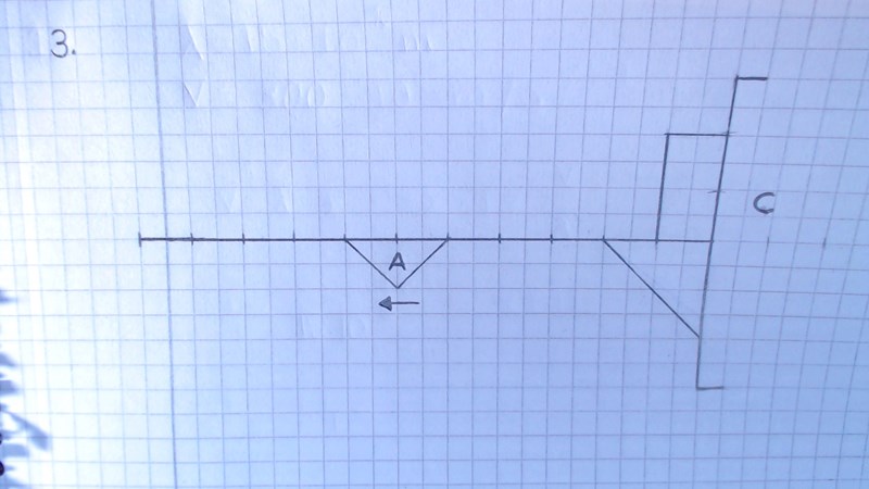 Om vi tittar på punkten närmast väggen C, så har du +4 rutor från rektangeln och -4 rutor från trianglen, summa 0. En ruta längre åt vänster har du +4 från rektangeln och -3 från triangeln, summa 1. Två rutor längre åt vänster har du +4 rutor från rektanglen och .2 rutor från triangeln, summa +2. Kan du rita detta?