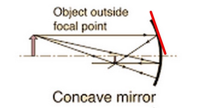 Den här spegeln är böjd, men precis där den övre strålen träffar får man samma reflektion som om spegeln vore plan (som den röda linjen).